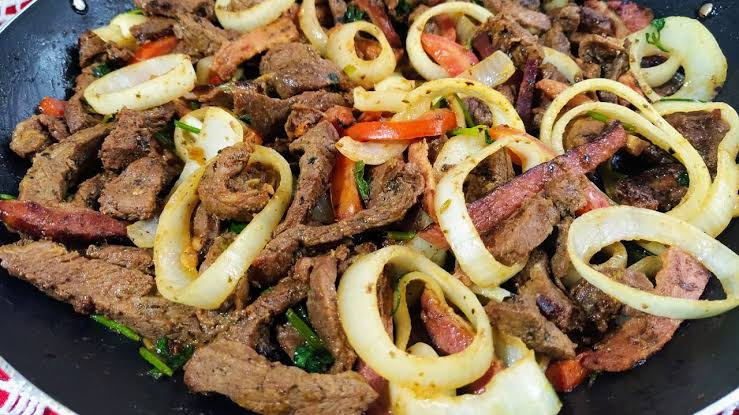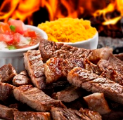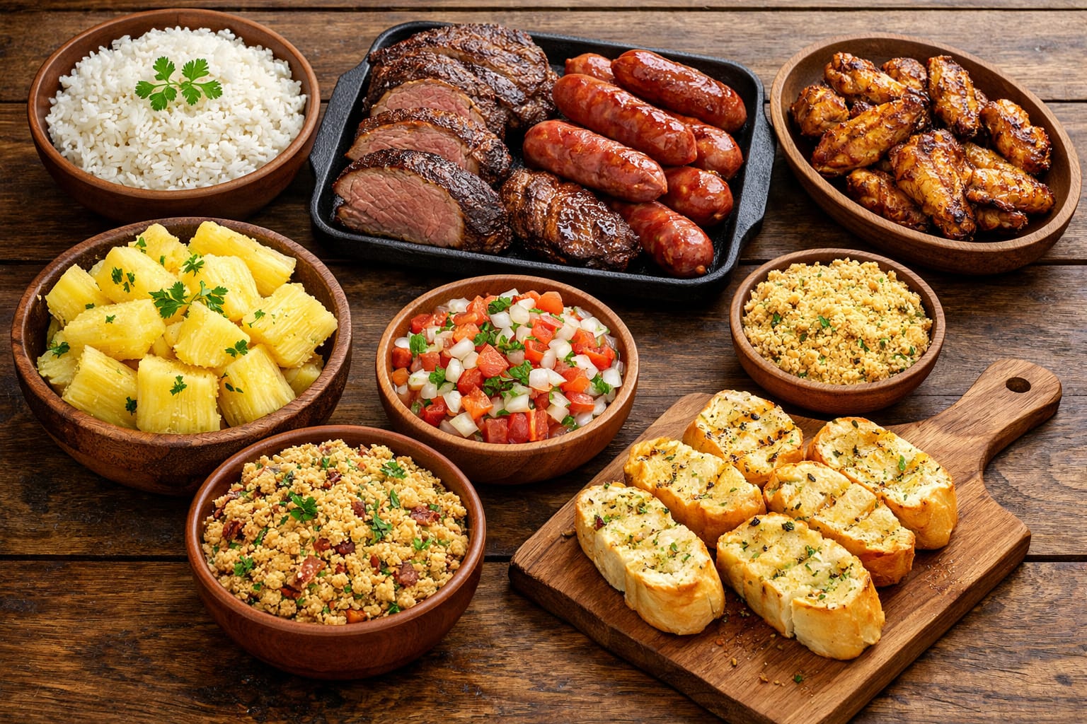 Arroz branco, carne, linguiça,asinha, pão de alho,farofa, vinagrete, mandioca cozida.
