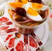 Carne, alface, cenoura, repolho roxo, repolho branco, azeitona roxa, azeitona verde, ovo cozido.