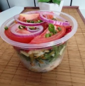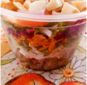 Frango, alface, repolho branco, repolho roxo, cenoura, tomate, beterraba ralada e abobrinha ralada.