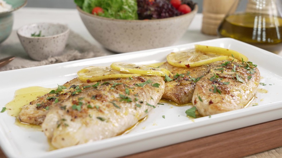 Tilápia, Alface, Cenoura, Repolho Roxo, Repolho Branco, Azeitona Roxa, Azeitona Verde e Ovo Cozido.